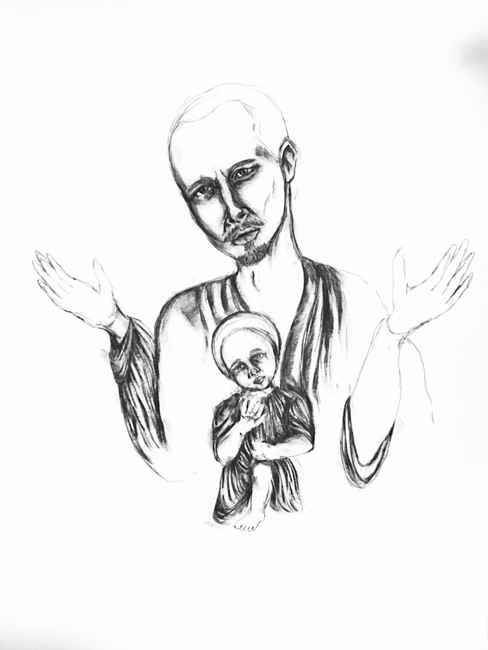 Tusche auf Papier 56 cm x 42 cm Die Arbeit hinterfragt traditionelle religiöse Symbole und Geschlechterrollen und thematisiert die Kluft zwischen religiöser Verehrung und tatsächlichen Machtverhältnissen und regt zur Reflexion über die Nutzung von Symbolen für politische Zwecke an.