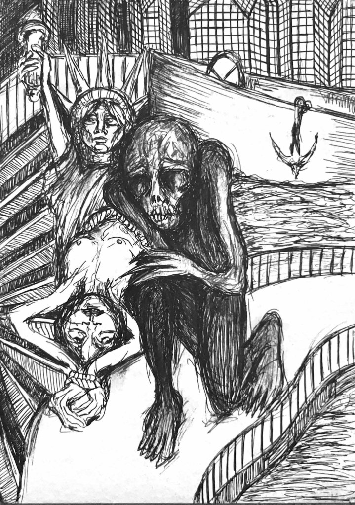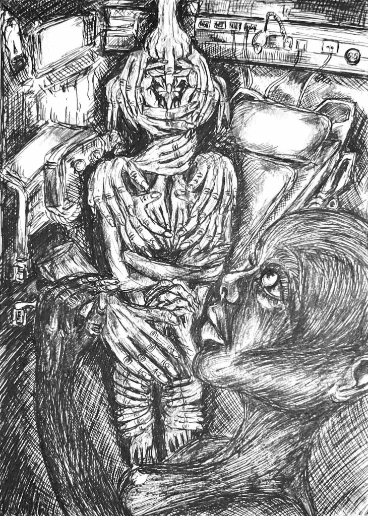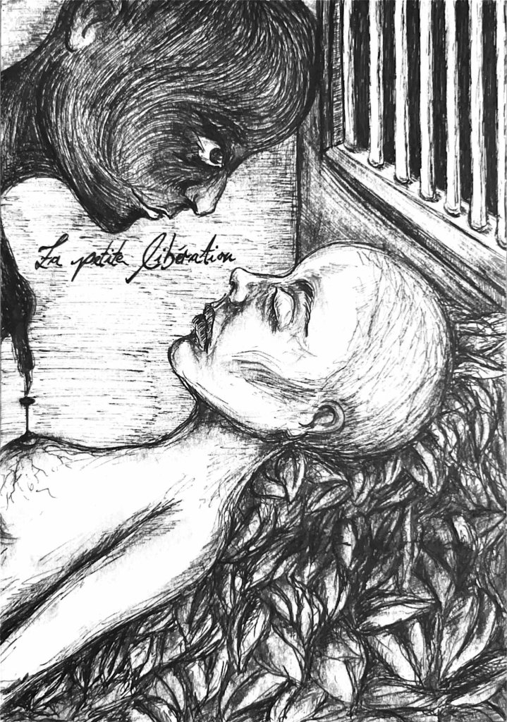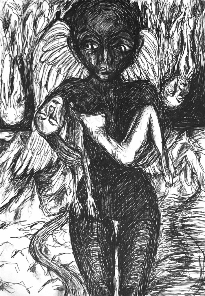 Im Spiegelsaal der Seele ist der Teufel los – oder wird er grade eingefangen? Wer kann das schon so genau wissen, wenn es um das Unbewusste geht. Sissi-Madelaine Schöllhuber beschäftigt sich in der Werkgruppe »Hall of Mirrors« mit dem Schatten. C. G. Jung hat mit ihm gewissermaßen das »Es« von Sigmund Freud wieder personalisiert, um mit diesem Schatten-Ich all die fragwürdigen Seiten des Selbst zu erkunden. Auf den ersten Blick sieht der dunkle Schattenmensch in den Zeichnungen von Sissi-Madelaine bedrohlich aus, auch bedrängt er das zeichnerische Ich, das hier ein Pendant zum lyrischen Ich sein mag: Es sind keine Selbstporträts, aber durchaus Wesenheiten des Selbst. Aber wer ist nun das eigentliche Ich? Beide Erscheinungen sind in einer Art Hassliebe aufeinander angewiesen, ergänzen sich hier, stoßen sich ab dort. In Ketten liegt die Seele. Ängste werden sichtbar, aber nicht nur auf der scheinbar realen Seite des Lebens, sondern auch auf dessen Schattenseite. Und immer wieder dringt noch die faszinierende und dunkle Seite von Paris ins Bild, wo die Bildserie entstanden ist. Die schönen Blumen des Bösen lassen grüßen.